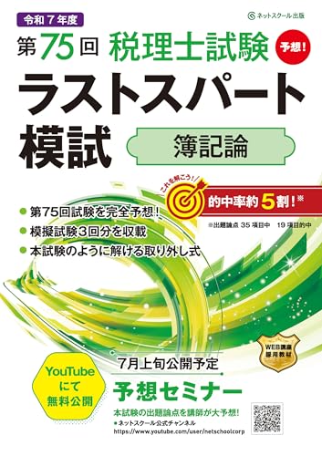 本書は2025年8月に実施される第75回税理士試験(簿記論)の合格を目指すために、最後の総仕上げとして解いていただきたい問題ばかりを集めた本試験レベル問題集となります。 本書では税理士試験(簿記論)の基本学習および過去問題演習を済ませ、あとは本番に向けてどう戦略立てて合格点を取ればよいのか悩んでいる方にはピッタリの1冊となります。 合格に必要な論点・問題が多く掲載されている本書を使って、税理士試験(簿記論)の合格をつかみ取りましょう! ≪本書の特長≫ 1.難易度・ボリュームが本試験に近い3回分の『予想問題』で実践演習ができる! 本書にある3回分の模試は、第75回試験で出題可能性の高い内容を第1予想から順に掲載しており、いずれも本試験に近いレベルで出題しております。 適度な質量で構成した予想問題を解くことで、基本学習および過去問題演習を通じて得た知識が身についているか確認できることに加えて、本試験でのボリュームや難易度にあわせた時間配分の練習ができます。 なお、予想問題を解く際はネットスクール公式YouTubeチャンネルにて公開している『まるで税理士試験会場(簿記論専用)』をご利用いただくことで、本試験の雰囲気を味わいながら問題演習ができます。 詳細は本書前付『合格をつかみ取るための効果的な本書の使い方』をご覧ください。 2.難易度・時間配分・ボーダーラインがわかる『解答・解説』で試験直前の復習ができる!! 『解答・解説』では各予想問題について大問別に難易度(5段階)・時間配分・目標点(ボーダーライン)を記載しているため、制限時間内でどこまで着手して正解すれば合格可能性が高いのか、ひと目で確認することができます。 また、本試験での合格まで自身に何が足りないのか(何を身につけておくべきなのか)原因を分析し、今後の学習に役立てることができます。 3.事前申込不要の『予想セミナー』で試験直前期の過ごし方がわかる!!! 本書掲載の予想にもとづいた『予想セミナー』を試験直前約1ヶ月前より配信する予定です。 気になる第75回試験の出題予想やその根拠、重要論点などをネットスクール税理士WEB講座担当講師が詳しくご紹介いたします。 是非、本書をお持ちになったうえで、お気軽にご参加ください。 ◆本書のご利用にあたって◆ 本書掲載の各予想問題の答案用紙はネットスクール株式会社ホームページ『読者の方へ』よりダウンロードすることができます。 税理士試験予想セミナー第75回試験を完全予想!! 『税理士試験 過去問ヨコ解き問題集』好評発売中! 問題用紙 ・答案用紙・計算用紙 解答・解説 第1予想 第2予想 第3予想
